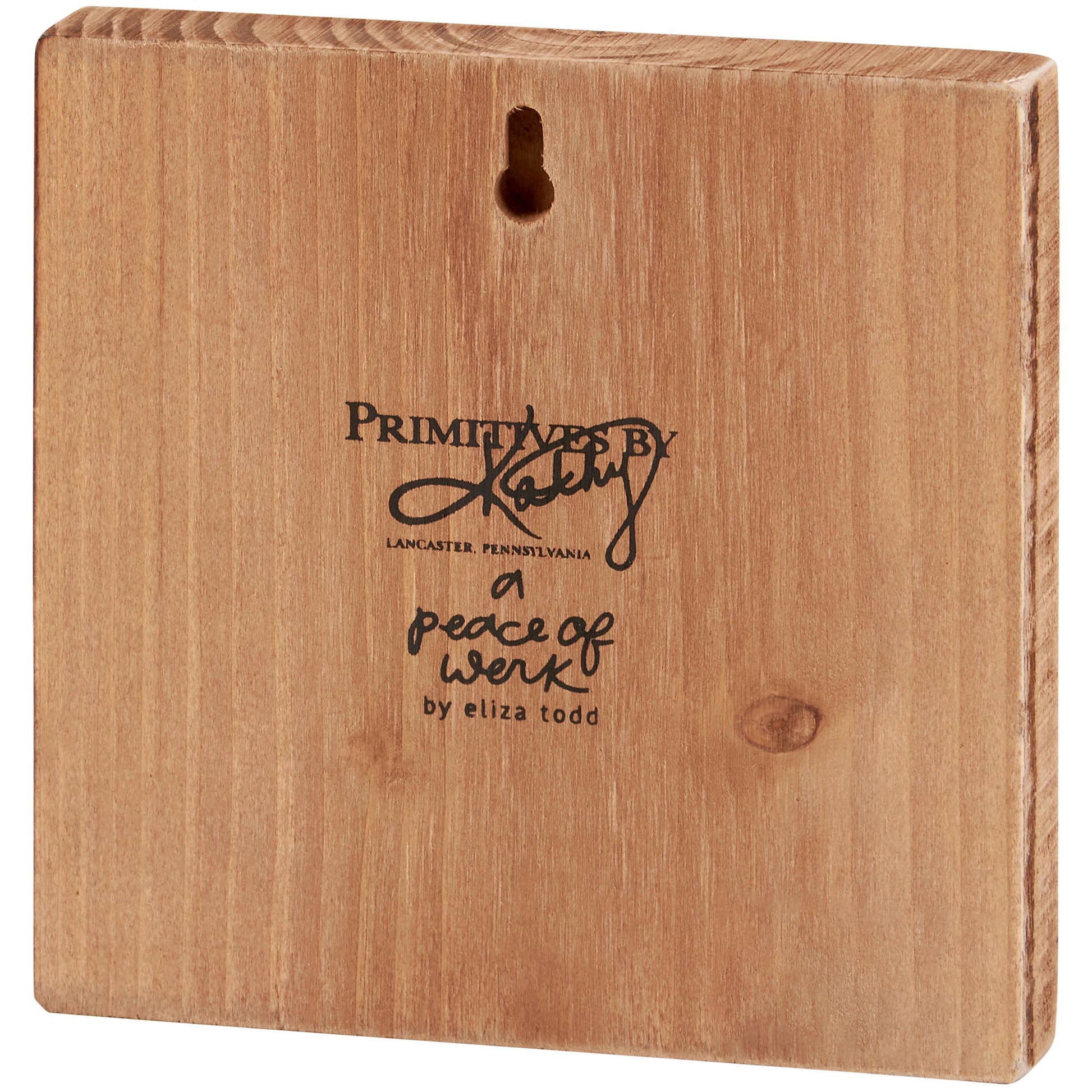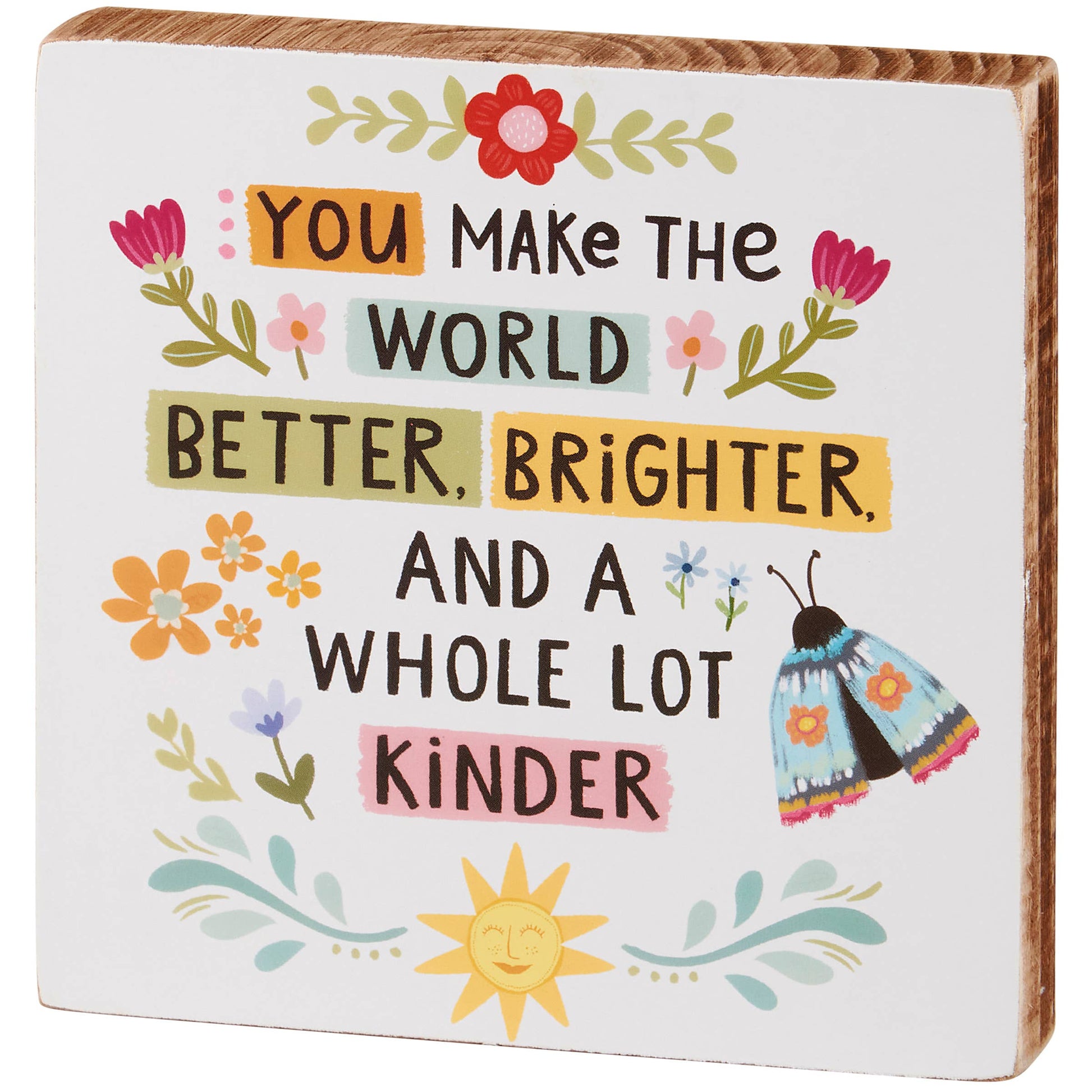 A colorful wooden block sign displaying a vibrant hand illustrated design of a butterfly, sun, and flowers surrounding an inspirational sentiment that reads "You Make The World Better, Brighter, And A Whole Lot Kinder." Block sign features coordinating natural wood on the sides and back. Our Better Brighter sign is easy to hang via predrilled keyhole slot or can free-stand alone. An inspirational everyday home accent great for gifting that can be easily displayed in any home or workspace.