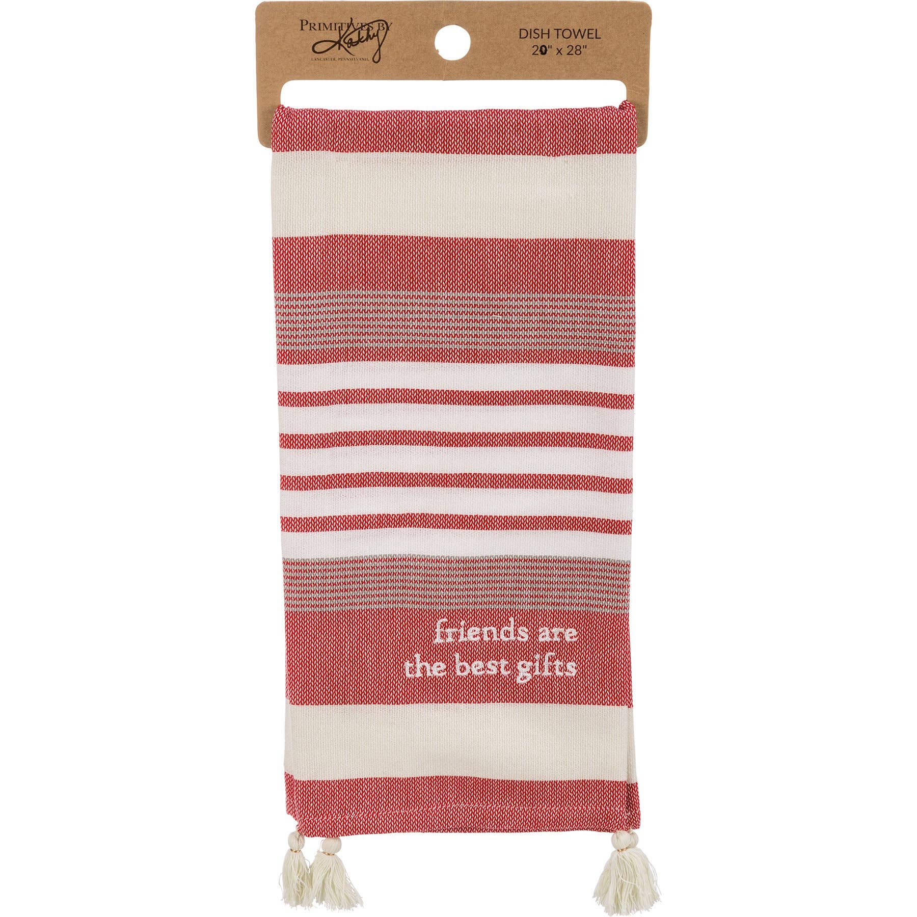 A cotton kitchen towel featuring a holiday-inspired color palette with embroidered "Friends Are The Best Gifts" sentiment and woven stripe designs. Includes tassel accents for added interest. Towel is packaged on a cardboard hanger. Machine-washable.