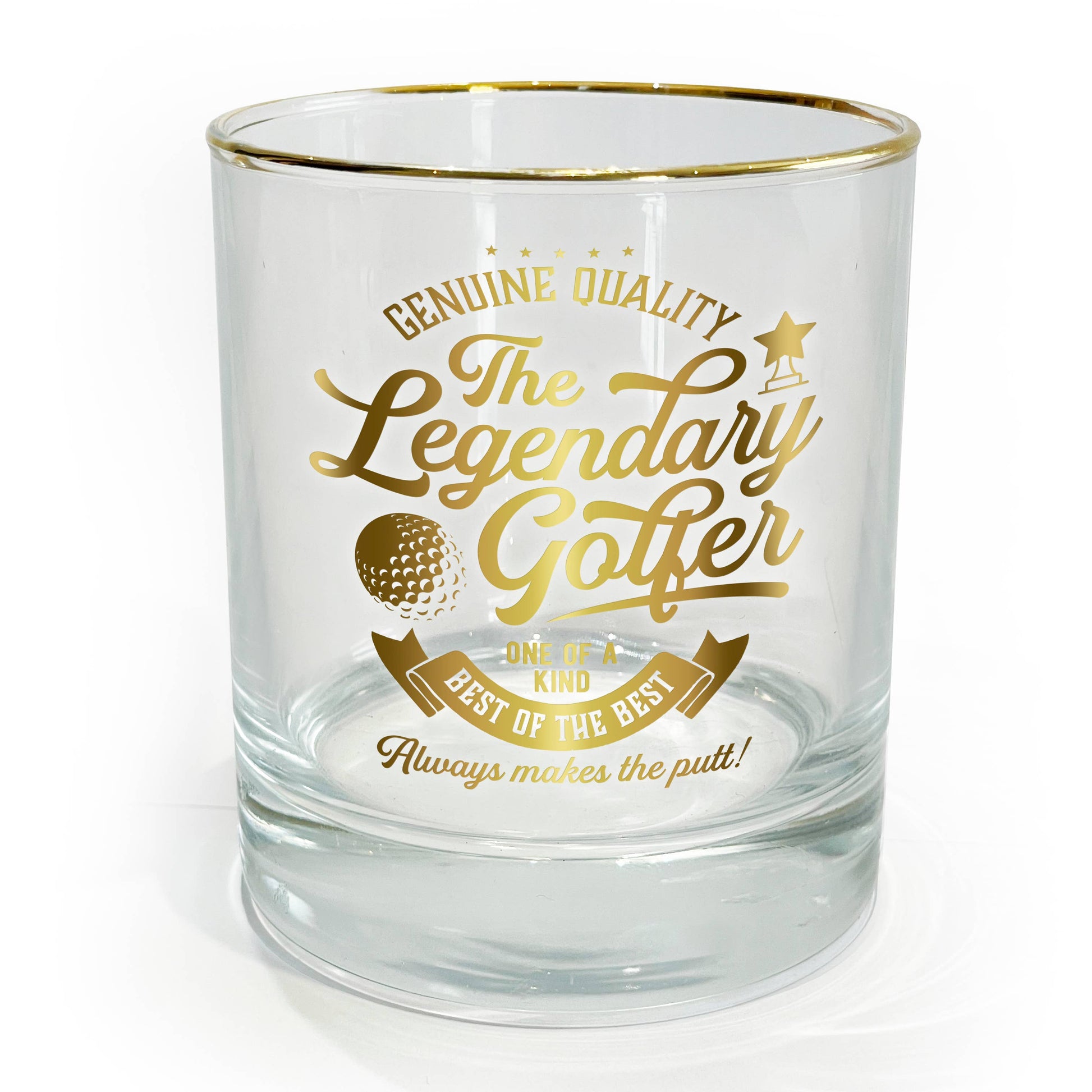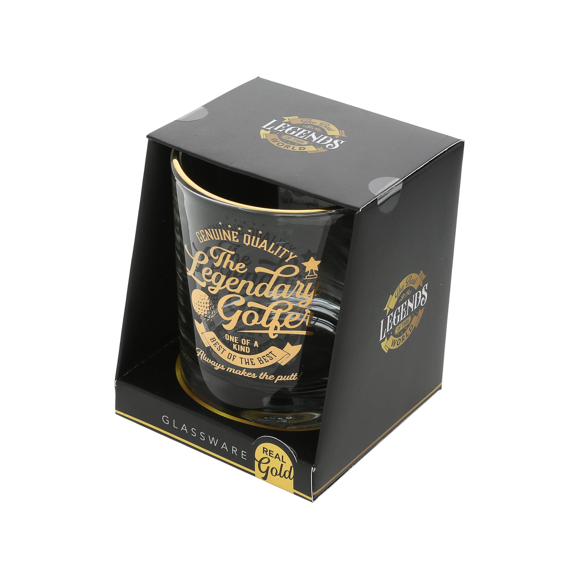 - Packaged in an open-faced black gift ready box with a To:/From: section the backside of the box. The gold electroplated rim is accompanied by the gold "Genuine Quality The Legendary Golfer One Of A Kind Best Of The Best Always Makes The Putt!" sentiment decal on the front side of the whiskey along with banners, stars, and a golf ball. Glassware with a refined, aesthetically pleasing look.