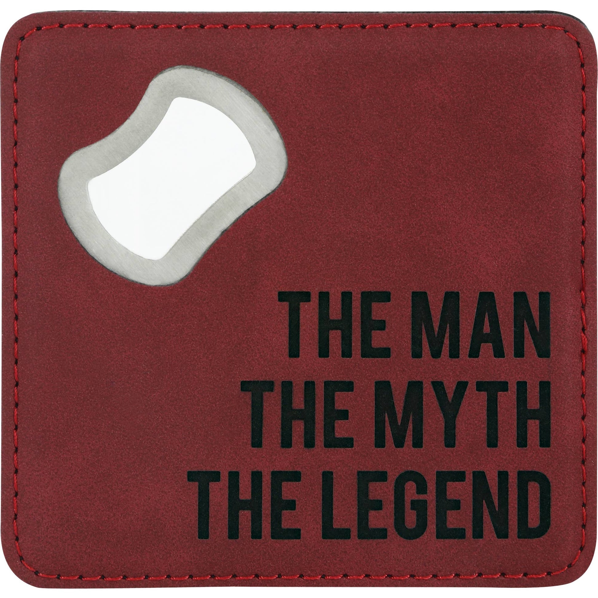 4" square dual-purpose bottle opener/coaster, packaged in a plastic polybag, is made from stainless steel, vegan leather, and faux suede. "The Man The Myth The Legend" text is laser-printed onto the front of the bottle opener/coaster. Wipe clean with a damp cloth. Great for gifting to a friend.