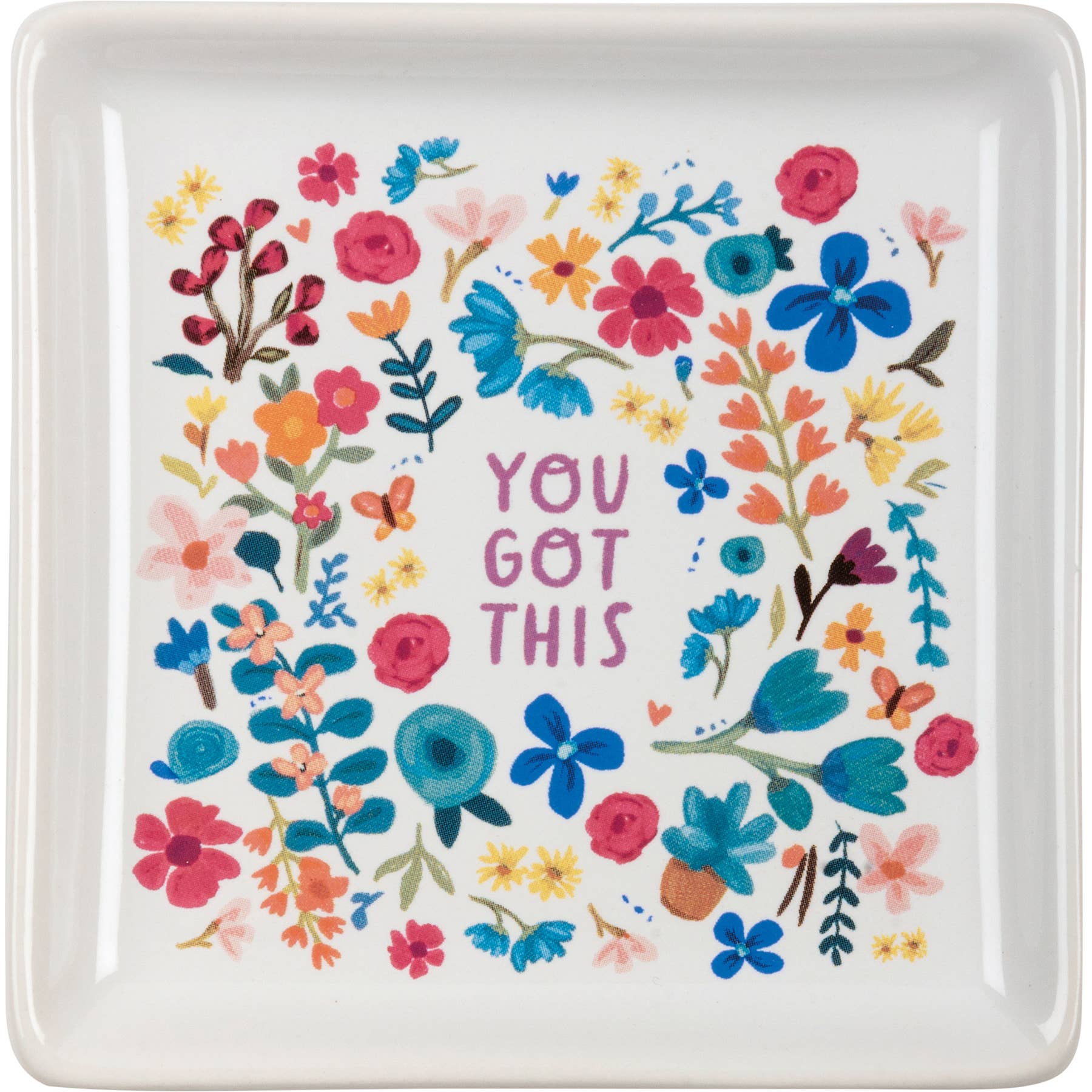 A glossy white stoneware vanity tray featuring vibrant floral designs with "You Got This" sentiment. Our You Got This tray is dishwasher safe.