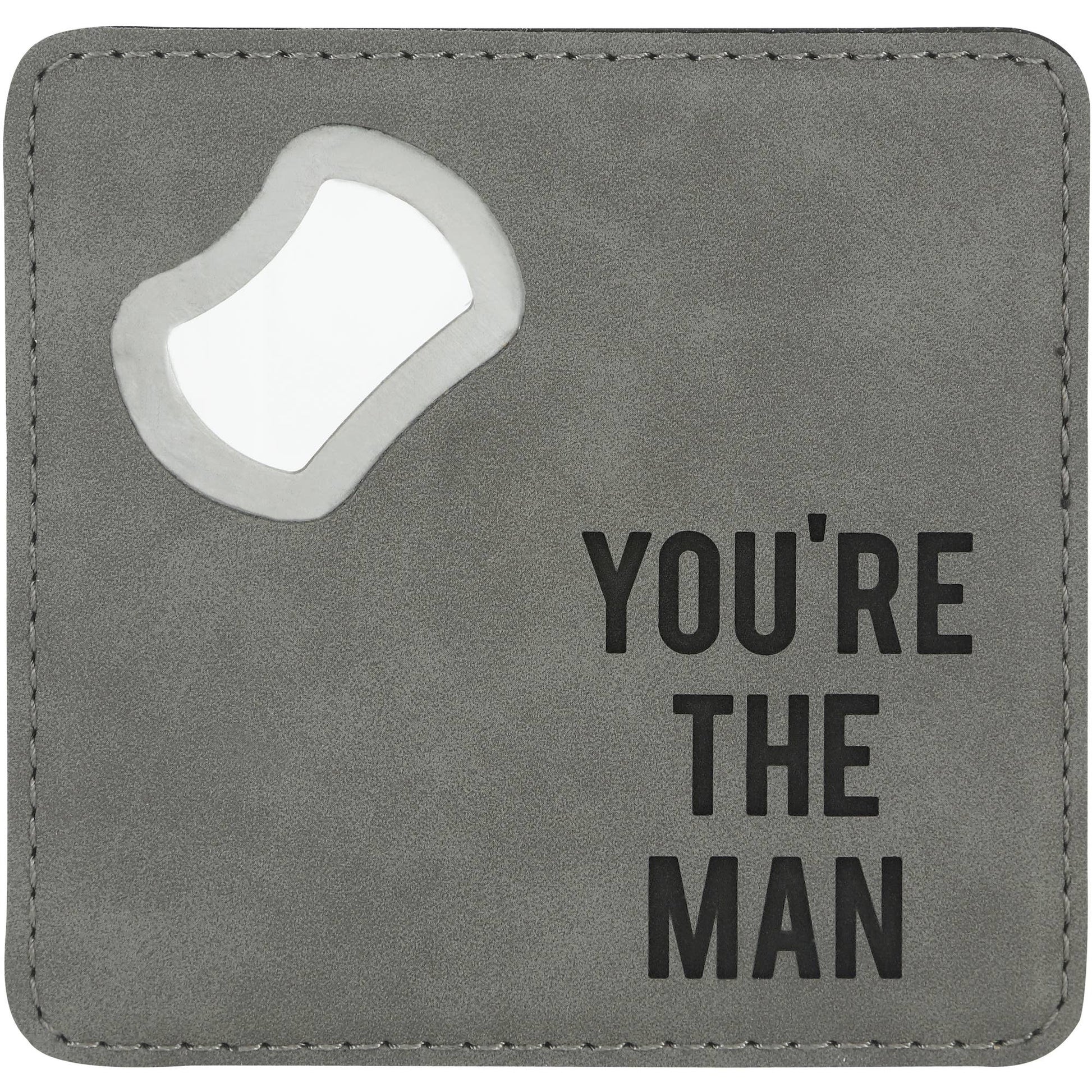 4" square dual-purpose bottle opener/coaster, packaged in a plastic polybag, is made from stainless steel, vegan leather, and faux suede. "You're The Man" text is laser-printed onto the front of the bottle opener/coaster. Wipe clean with a damp cloth. Great for gifting to a friend.