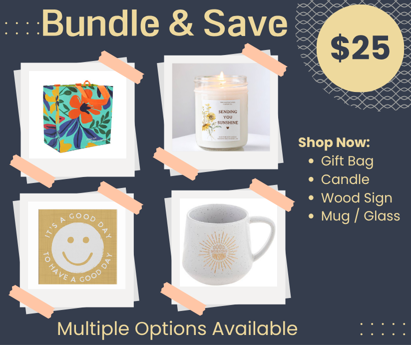 Shop now for gifts for everyone! Gift bag, candle, wood sign & mug or glass - all for $25.00.
